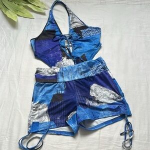 NWT SHEIN ICON Patchwork & Denim Look Print Drawstring Side Shorts Set