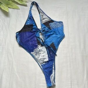 SHEIN ICON Patchwork & Denim Look Print Drawstring Side Shorts and Open back Bodysuit with snap closure