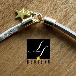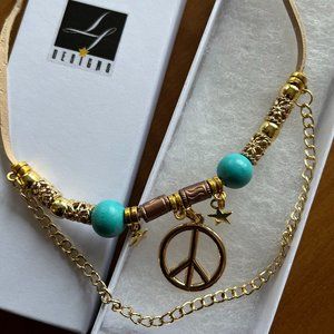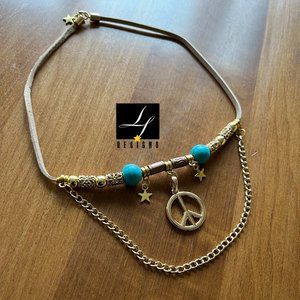 NWT: This lovely boho beige leather choker is aptly called Starry CenterPeace for its unique placement of a solitary peace symbol surrounded by wooden turquoise beads and book ended with gold stars. A small gold plated chain under the peace gives it a charming finish.