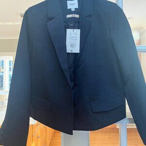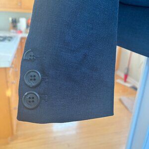 A beautiful navy (night sky) blazer that I bought on a whim on sale. Made of polyester, viscose and elastane. Size xs. Noticed a cracked button, but there are buttons included to replace. Perfect with jeans or with a dress for spring.