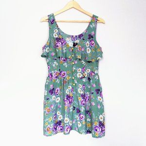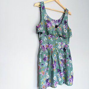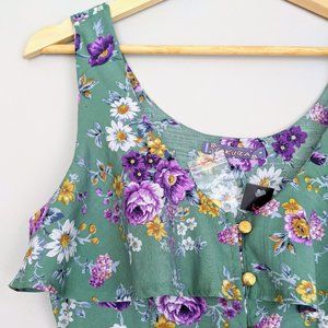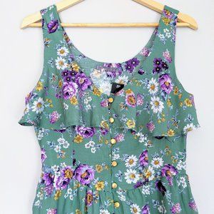 Sakura floral sleeveless mini sundress. Pale green with purple, yellow and white floral print. Gold buttons on front, ruffle along bustline. 2 pockets. Hidden side zipper. Size M. 100% Rayon. No country of manufacture tag.