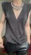NWT Chic black women sleeveless top. Size Small. V-neck, Padded shoulders. Sexy hidden slit across the front. The fabric is light, textured and densely pleated with silky drape. Elastic in the bottom hem.