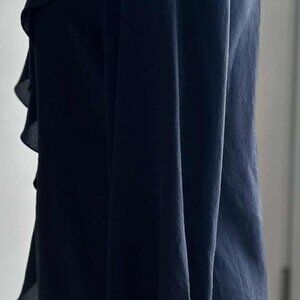 Shan elevates sheer silk into a study of movement, shaping this ink-blue blouse in a fluid crepe that drapes with quiet precision. The ruffled collar flows into a soft cascading front, balanced by slim silk ties tipped in polished metal. Light gathers at the shoulders and cuffs lend subtle structure while keeping the silhouette effortless, allowing the purity of the silk and the discipline of the construction to define the piece. Crafted in Canada with the atelier refinement the house is known for.