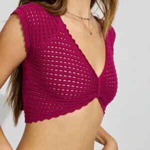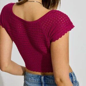 NWT Sheer V-Neck Knit Crop Tee Red Plum Burgundy