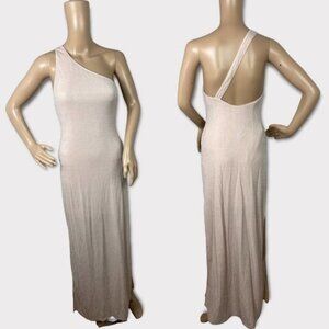 Show Me Your Mumu One Shoulder Cream Maxi Dress. Has a bit of a sparkle. Two front slits. Perfect for a bridesmaid or special occasion dress. Brand new with tags! Please note that this was a sample piece so no size tag but see measurements below - fits like a small (and has a lot of stretch). Note that the model photo was digitally created to show fit. Some details may vary.