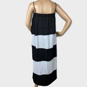 Show Me Your Mumu Black and White Tiered Maxi Dress. Square neckline. Adjustable spaghetti straps. Colour block pattern. Cascading tiers of black and white. Elastic at the chest (can also be worn as strapless). Fully lined. Brand new with tags! No flaws but please note this is a sample piece so no size tag - see measurements below. Fits like a small. Note that the model photo was digitally created to show fit. Some details may vary.