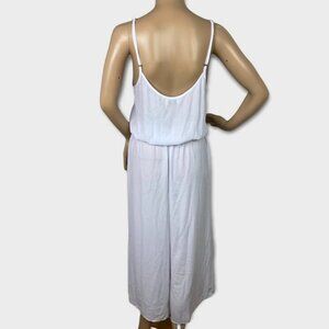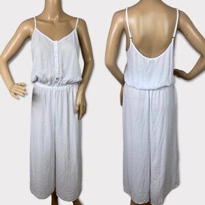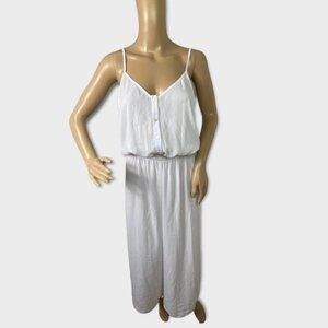 Show Me Your Mumu Evie White Wide Leg Crop Jumpsuit. Button down style. Elastic waist. Adjustable spaghetti straps. Brand new with tags! No flaws but note this is a sample piece so no size tag. See measurements below - fits like a women's small. Note that the model photo was digitally created to show fit. Some details may vary (e.g, there are no pockets).