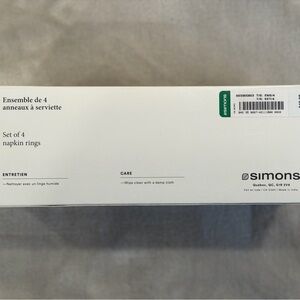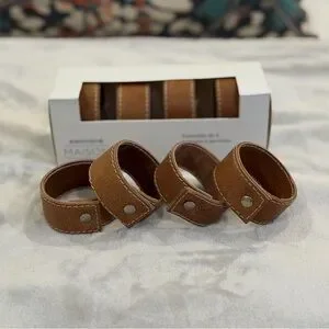 Understated and relaxed, these napkin rings from Simon’s look like leather with baseball stitching. One set new in box, the other unboxed but unused. Set of 8, wipe clean.