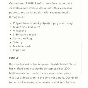 Crafted from PAIGE'S soft stretch faux leather, this sleeveless midi dress is designed with a v-neckline, pockets, and an A-line skirt with seaming details throughout.