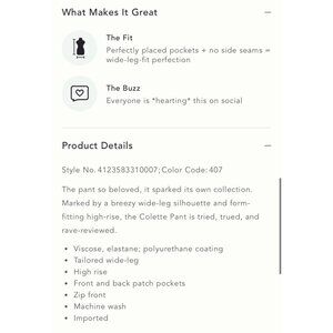 The pant so beloved, it sparked its own collection. Marked by a breezy wide-leg silhouette and form-fitting high-rise, the Colette Pant is tried, trued, and rave-reviewed.