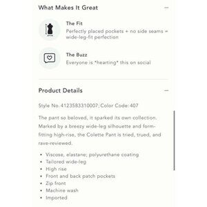 The pant so beloved, it sparked its own collection. Marked by a breezy wide-leg silhouette and form-fitting high-rise, the Colette Pant is tried, trued, and rave-reviewed.