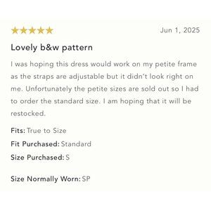 Grabbed this in store to try on and ended up Loving it. It does run large and has a bit of side boob action but it’s super cute and comfy for summer. Breezy and loose but still shapely. The fabric also has a bit of texture to it which makes it feel high end.