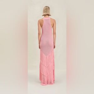 The True is a mock neck, knitted maxi dress with three layers of fringe detailing at the hem.