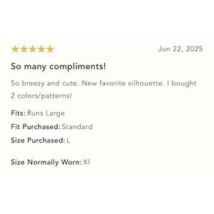 Love the pattern, something a little different from the usual spring florals. Definitely runs big, but if I went any smaller it would mint fit around the armpits.