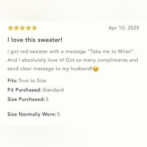 I got red sweater with a message “Take me to Milan”. And I absolutely love it! Got so many compliments and send clear message to my husband!😊