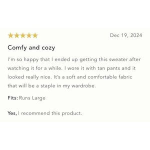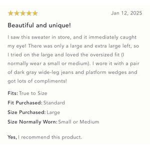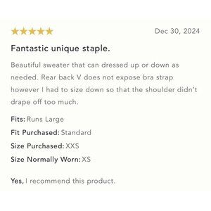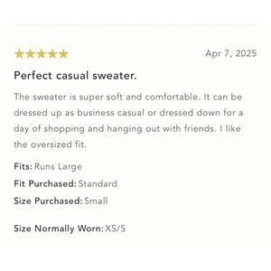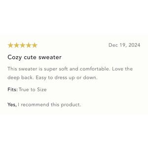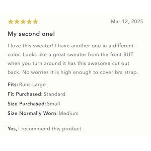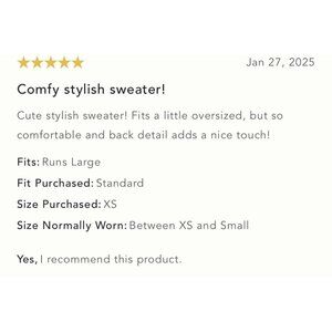 Cute stylish sweater! Fits a little oversized, but so comfortable and back detail adds a nice touch!