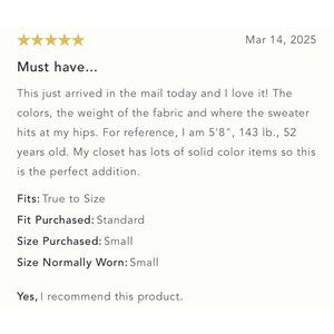I love it! The colors, the weight of the fabric and where the sweater hits at my hips. For reference, I am 5'8", 143 lb., 52 years old. My closet has lots of solid color items so this is the perfect addition.