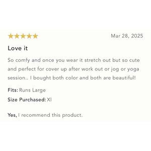 So comfy and once you wear it stretch out but so cute and perfect for cover up after work out or jog or yoga session.. I bought both color and both are beautiful!