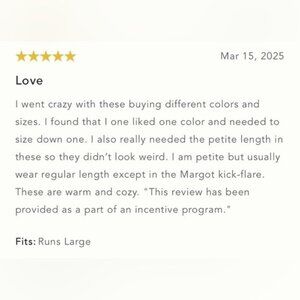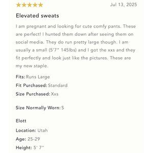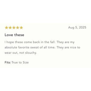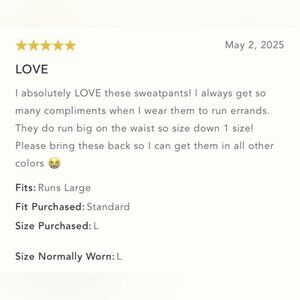 I absolutely LOVE these sweatpants! I always get so many compliments when I wear them to run errands. They do run big on the waist so size down 1 size! Please bring these back so I can get them in all other colors 😭