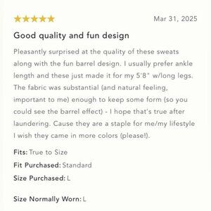 These barrel cut sweats are unexpectedly cute. I grabbed them on sale and was surprised by both the quality and cut. Nice barrel shape without being overwhelming on the body. Get them while still available