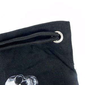 There are two black cords on either side of the bag so it can be worn like a backpack. They are held in place with a secure grommet and a faux-leather patch