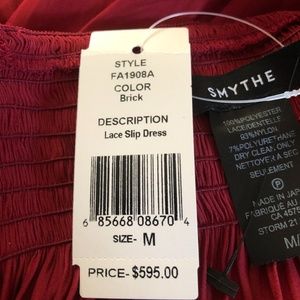 Beautiful deep red square neckline dress with lace inset at shoulders and chest. Red described as "brick" by Smythe.