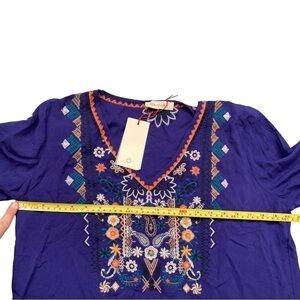 Brand new with tags from the brand Solitaire. Royal blue blouse with 3/4 sleeves and embroidered bohemian details. Large bib design around the neck and geometric triangle cut outs at the sleeves. Mandala on the back as well. Fits about a size large. Bust is about 40”. Length is about 24”