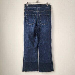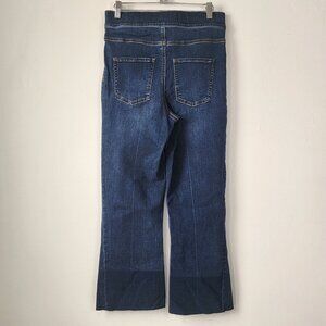Spanx jeans, cropped jeans, women's flare jeans, dark wash denim, denim stretch jeans, flare leg pants, cropped denim, dark blue jeans, Spanx denim, medium size jeans, comfortable jeans, retro style denim, modern cropped pants, Spanx, Stretch Denim, Flared Leg, Raw Hem
