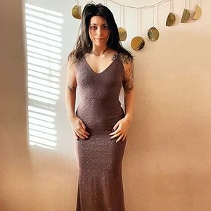 Beautiful maxi dress in an understated purple/taupe colour with a soft sparkle tint to it. The dress is form fitted, yet super stretchy and comfortable. Will probably fit sizes 4-8 depending on how you like your fit. Criss cross straps, low back with a bow accent that cascades into flowy material that gives an amazing silhouette from the back.