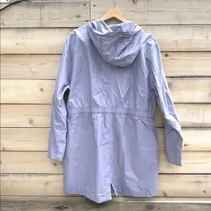Light summer jacket, 25” length, hooded, slight gather at waist