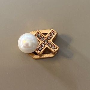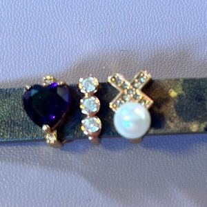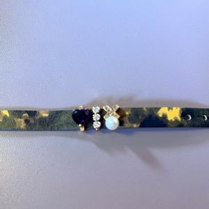 This is an NWT Stella & Dot brown camouflage leather band that reverses to burgundy - 8-3/4" long. 3 charms have been added to the bracelet - a pavé rose gold charm with a pearl for O and a pave X, 3/8" in size; a trio of sparkly crystals and a purple heart charm. These charms work with mesh and leather bands from Keep Collective.