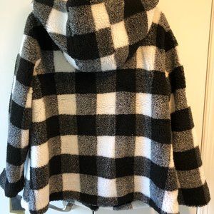 NWT Steve Madden Black and White Buffalo Checkered Winter Jacket. Fun Faux Fur With Hood, Pocket on either side. Fully Lined. Three Black Button closure.