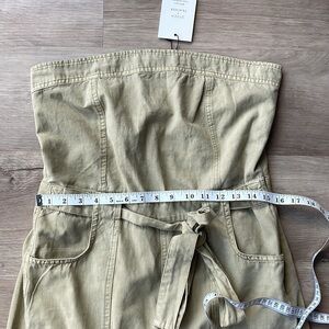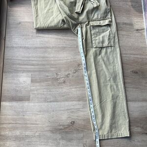 NWT! Only tried on. Super cute cargo jumpsuit in an army green/khaki color. Size large. Has elastic back so it has some give in the bust area, the fabric itself does not have stretch. Straight leg and very flattering on. There is a side zipper and waist tie. I am 5’4 and the bottoms hit right at my foot.