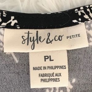 NWT Style & Co. Women’s Short Sleeve Top Black & White Design With A Pleated Neckline. Dressy Or Casual. Size Petite Large.