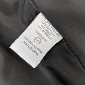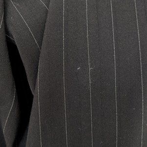 Suzy Shier blazer. Black pinstripe. Single button style. Button detailing on sleeve. Lightly padded shoulders. Size 11/12 (but see measurements). 62% polyester, 32% rayon, 6% spandex. New with tags, but noticed a tiny white fleck on the upper right sleeve from storage (last photo). Not sure if this will come out. Fabric attracts pet hair.