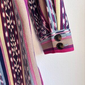 Thick woven Sézane button-up dress featuring a colorful world-textile inspired pattern. Ideal for fall and winter — pair it with boots and tights as a dress, or layer it open over a tee or turtleneck.