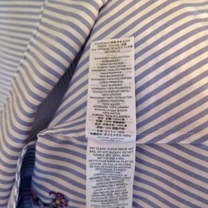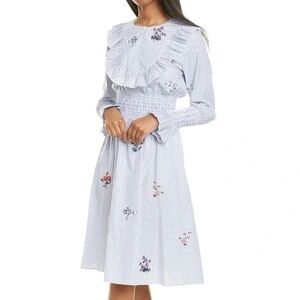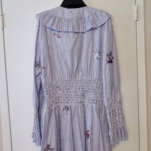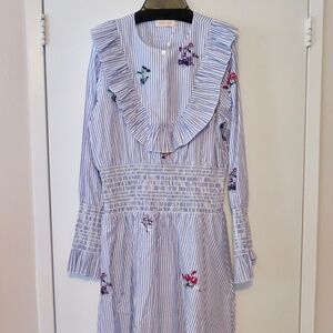 This listing is for a new with tags Tory Burch striped dress in Size 14. It is made of a soft blue and white finely striped cotton fabric that is embellished with embroidered and sequinned flowers.