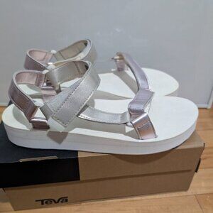 Rebooting the classic Midform with high-shine straps, the Universal Shimmer delivers a lighter footprint in a dreamy new package. Topped with metallic foil, this edgy platform sandal keeps leather out of landfills by utilizing reconstituted leather straps. With a lightweight EVA foam midsole for extra cushioning and a rubber outsole for traction. This style is recyclable the TevaForever recycling program accepts any style of your well-loved Teva sandals to be recycled and they'll never see a lan.