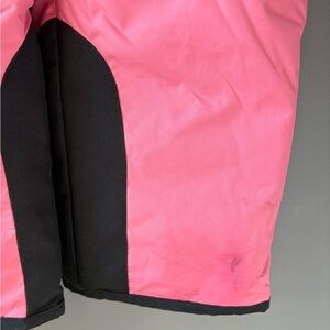 Stylish pink snow bib overalls with black accents. Perfect for winter activities.