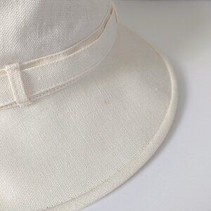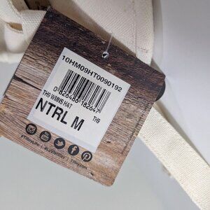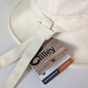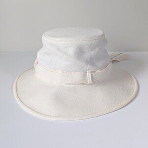 Tilley TH9 Melanie Hemp Hat. This model has now been discontinued by Tilley. Brand new with tags. Has been stored in and will be shipped in its original Tilley shipping box. Made in Canada. Size M (7 1/8 - 7 1/4; 56 cm - 57 cm). There are a couple of tiny discoloured spots natural to the hemp fabric, one on the brim and one on the underside of the brim (see photos).