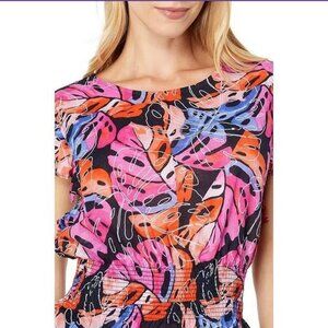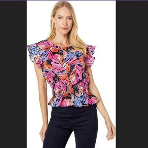 NWT Tommy Hilfiger %100 Cotton Flutter Sleeve Smock Waist Palm Leaf Ruffle Top