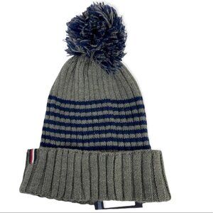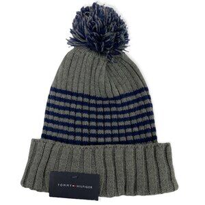 NWT Tommy Hilfiger Blue Grey Striped Ribbed Knit Pom Pom Hat Toque Beanie NEW