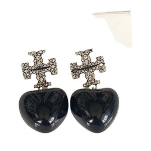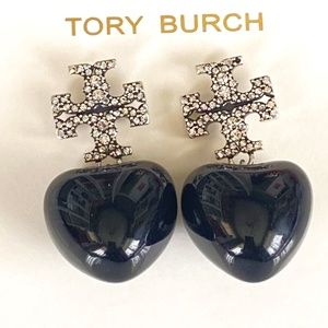 NWT Tory Burch Pave Double T Logo Stud with Black Heart Drop Rtl $220