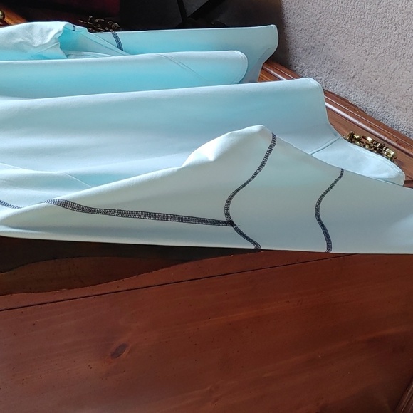- pale blue green pastel shade, very pretty with navy detailed stitching on arms and around neck
