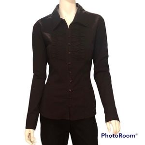 NEW WITH TAGS - Stylish button up dress shirt with ruffles on the front. It is made of a smooth cotton fabric with stretch for a tailored yet comfortable look. It buttons up with elastic loops and comes with an extra button. Labelled size large.