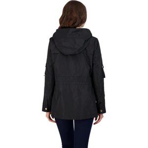 This cinch waist rain jacket by Via Spiga will be your favorite go to. Made with 100% polyester, water repellent materials that will guard you from rain and drizzle while running errands or commuting to work. It features a lightweight, slimming cinched waist and front welt pockets. Guard your face and neck with the attached hood. This coat also features a full zipper closure. This jacket is guaranteed authentic.