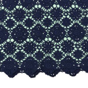 "An inky-blue overlay of crochet lace pops against the mint-green background of a slim skirt ending in a pretty, scalloped hem."