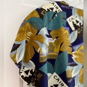 Bold and playful vintage blouse featuring a vibrant travel-themed print with “Cairo,” hotels, and tropical leaves. Rich jewel-tone colors of teal, gold, navy, and white make this a standout piece from the late 1980s to early 1990s.