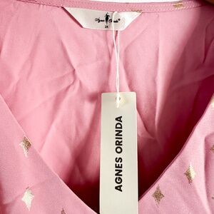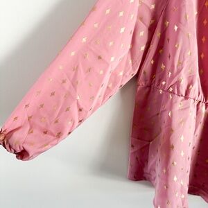 Gorgeous Vneck pink long sleeved blouse with elastic waist. Tunin comes with aa unique gold diamond print all over and is in wonderful new condition.