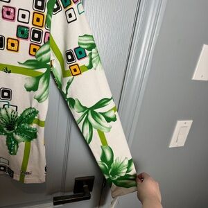 Insane and extremely rare graphic top from Miss Sixty, likely the only one of its kind. It is a sample piece from February 2005. Made from a super soft 100% cotton, with retro geometric and Y2K digital flower print details. Front is decorated with intricate beading and sequins. Deep V-neck.Super frutiger aero, an absolutely stunning and rare piece 💚
